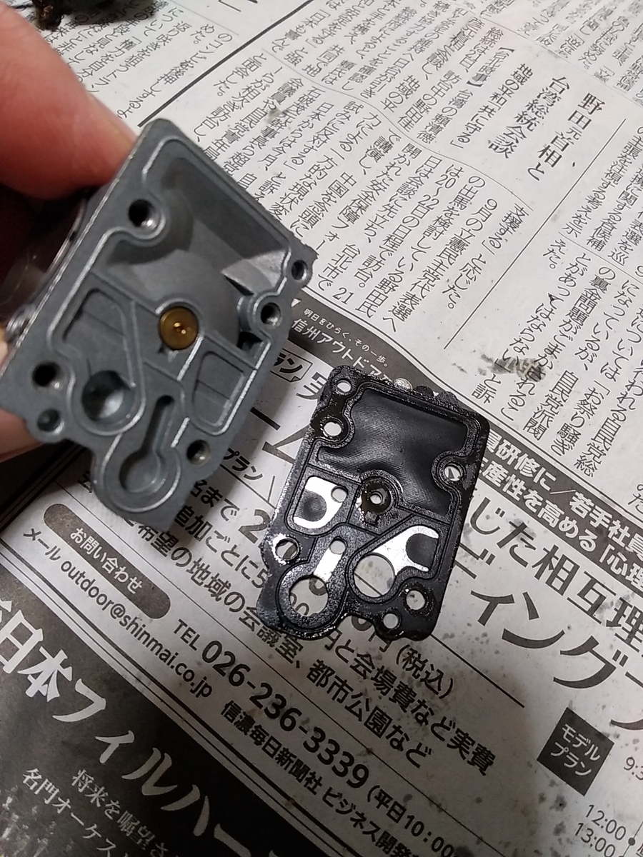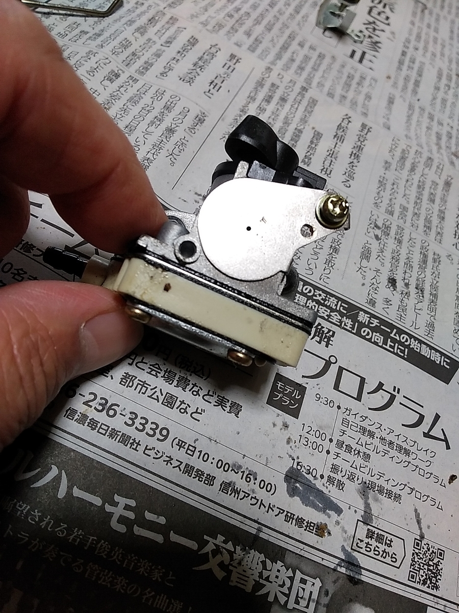 先日メンテナンスした機種のキャブレターはポンプダイヤフラムとメタリングダイヤフラムの間にスロットルバルブがあるので厚みがありますが、この機種の場合ロータリーバルブを採用しているのでポンプダイヤフラムとメタリングダイヤフラが一体化しているから、厚みはなくてコンパクトにまとまっています。